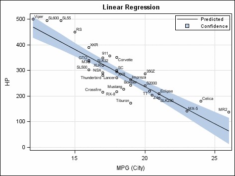 回归是一类机器学习,用来确定一个真值,就像一个数字。最流行的回归算法是Leaner Regressor。下面是一个2-dimnails线性回归的例子。基于车辆的马力(HP)和车辆的燃料效率(MPG,英里/加仑),模型被绘制在平面图上。然后通过绘制的点绘制趋势线(通过算法)。在线性回归模型中,用于绘制趋势线的算法是从基本代数导出的y = mx + b。一旦绘制趋势线被绘制出来,我们可以做出预测。例如,如果我的新车有400马力,我可以预测它的燃油效率将是大约14英里/加仑。