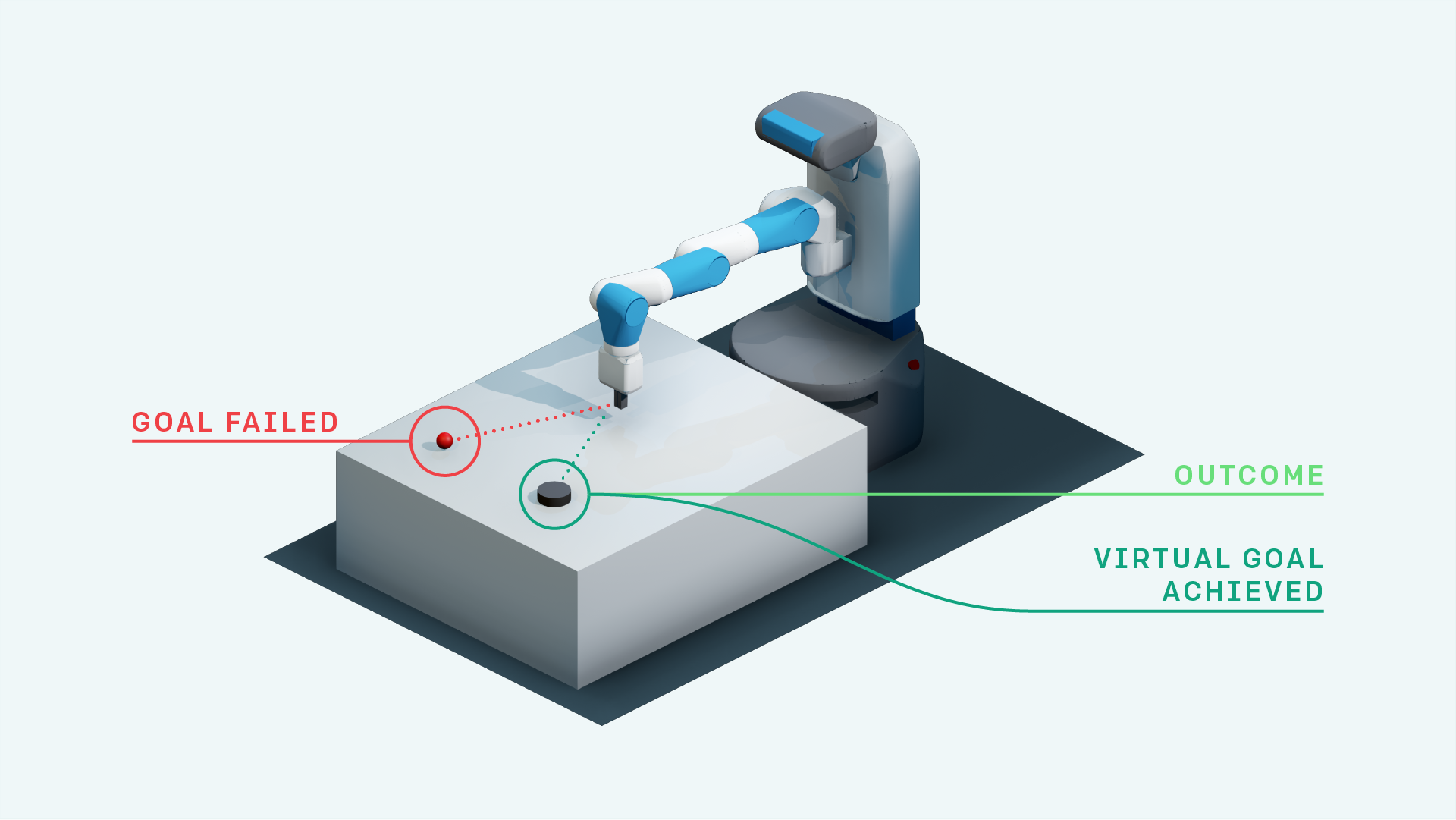 为了了解HER的作用,让我们在FetchSlide(上文提到)的背景下看一看,我们需要学习将一个冰球滑过桌子并击中一个目标。我们的第一次尝试很可能不会成功。除非我们非常幸运,否则接下来的几次尝试也很可能不会成功。典型的强化学习算法不会从这种经验中学到任何东西,因为它们只获得一个不包含任何学习信号的恒定奖励(在这种情况下是-1)。
