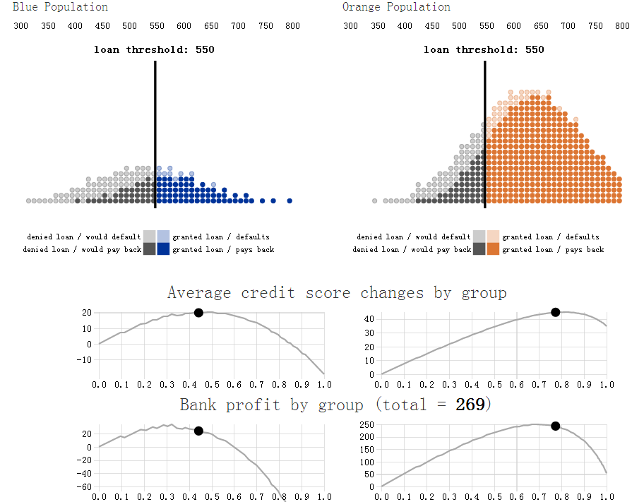 尽管这些公平标准是考虑均衡静态决策的一种自然方式,但他们经常忽略这些政策对人口结果的未来影响。图6通过对比最大利润,人口平等和机会均等带来的政策来说明这一点。尝试选择每个贷款策略来查看他们导致的银行利润和信用评分变化。与最大利润相比,人口均等和平等机会都会降低银行的利润。但是,他们是否改善了蓝色人口超过最大利润的结果?尽管相对于利他最优而言,最大利润策略偏向于蓝色区域的人群,但相对于利他最优化而言,机会均等相对过度,而人口均等则超过了对蓝色人群造成相对危害的程度。