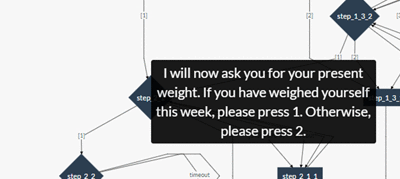 一个简单的DSL被用来描述呼叫脚本。在前述图表中,右侧面板通过呼叫脚本给出了一个流程的视觉再现。DSL允许分支,条件逻辑还有变量被使用,因此流程会根据需要来变得简单或困难。