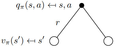 分解的价值函数(公式8)也称为马尔可夫奖励过程的贝尔曼方程。该函数可以在节点图中显示(如下)。从状态s开始得到价值v(s)。处于状态s我们有一定的概率Pss'到下一个状态s'。在这种情况下,我们有两个可能的下一状态。 为了获得值v(s),我们必须计算由概率Pss'加权的可能的下一个状态价值v(s')的总数并加上加上状态s的即时奖励 。这就是公式9,只不过是在方程中执行了期望算子的公式8。