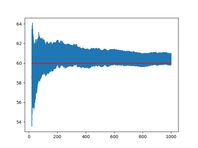 pyplot.plot(range(20, n), [60 for x in range(len(means))], color='red')