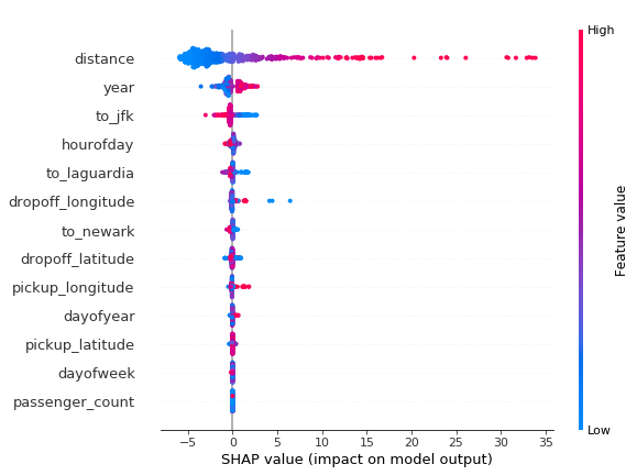 另一种了解每个特性对模型输出影响分布的方法是SHAP摘要图。SHAP值是特征之间的公平信用分配,并具有博弈论一致性的理论保证,这使得它们通常比整个数据集的典型特征重要性更值得信赖。