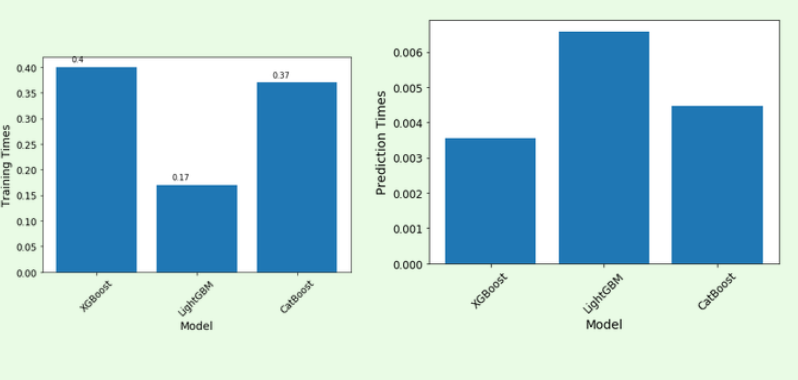 LightGBM在训练和预测时间上都是明显的赢家,而CatBoost则略微落后。XGBoost花了更多的时间来训练,但是有合理的预测时间。(在增强树中进行培训的时间复杂度介于(log)和(2),和预测是(log2);=数量的训练例子,=数量的特性,和=决策树的深度)。