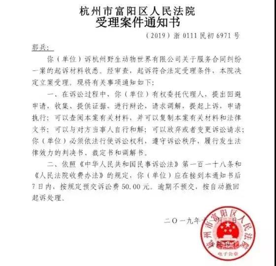协商未果。于是,郭兵于2019年10月28日向杭州市富阳区人民法院提起了诉讼,目前杭州市富阳区人民法院已正式受理此案。