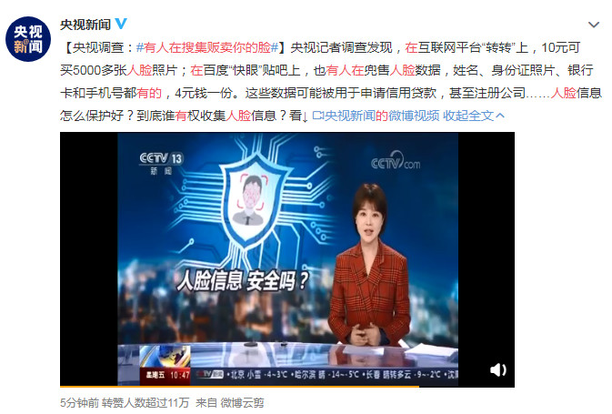 近日,央视记者调查发现,在互联网平台“转转”上,10元可买5000多张人脸照片;在百度“快眼”贴吧上,也有人在兜售人脸数据,姓名、身份证照片、银行卡和手机号都有的,4元钱一份。这些数据可能被用于申请信用贷款,甚至注册公司……