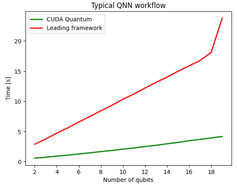 图 2 将 CUDA Quantum 与领先的量子计算 SDK 进行了比较,两者都利用 NVIDIA cuQuantum 后端以最佳方式将电路仿真卸载到 NVIDIA GPU 上。在这种情况下,使用 CUDA 昆腾的好处是孤立的,与领先的框架相比,平均性能提高了 5 倍。