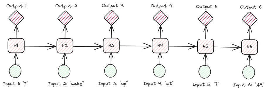 如果我们以文本数据为例,想象一下我们有一个句子“I wake up at 7 AM”,然后我们将单词作为输入。在前馈神经网络中,当我们到达单词“up”时,模型已经忘记了词汇“I”、“wake”和“up”。然而,RNN会使用每个单词的输出,并将它们循环回来,以便模型不会忘记。