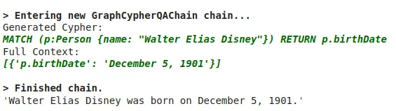 最后我们将向你展示如何通过构建Cypher语句在知识图谱中浏览信息。Cypher是一种结构化查询语言,用于处理图数据库,类似于SQL用于关系数据库。LangChain有一个GraphCypherQAChain,它读取图的模式,并根据用户输入构建适当的Cypher语句。