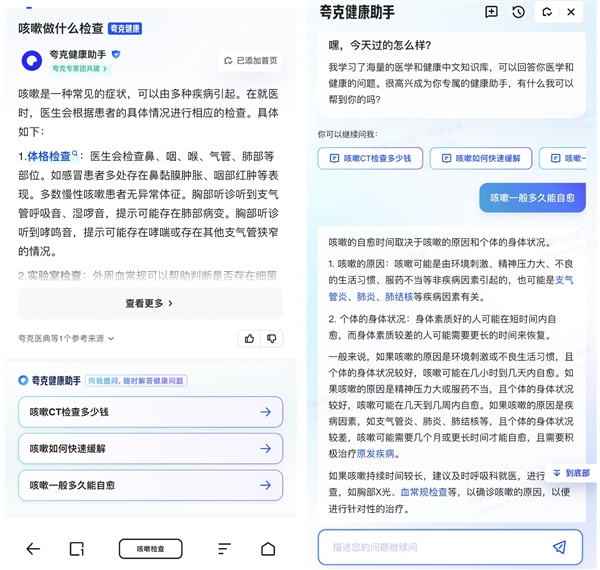 夸克健康助手不仅可以在搜索结果中回答用户的健康问题,还可以在独立的功能页面中与用户进行多轮对话,呈现更多维度的内容。此外,夸克还增加了智能筛查功能,让用户可以通过勾选症状信息,快速找到匹配的健康搜索结果和常见病症问题。