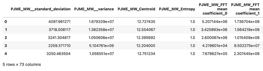 如果我们现在看一下训练数据的前几行,这就是它的一个快照。我们现在有 73 个特征,这些特征是从我们使用的时间序列特征库中添加的。根据这些特征,我们要预测的标签是第二天的能耗水平。
