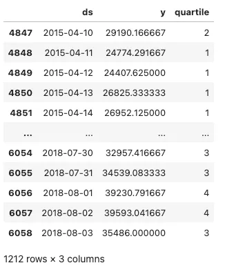 我们首先将这些数据转换为每日的平均能源消耗,并将各列重命名为 Prophet 预测模型期望的格式。这些实际值的每日能源消耗水平被转换为四分位数,这就是我们试图预测的值。我们的训练数据如下所示,以及每个每日能源消耗水平所属的四分位数。四分位数是使用训练数据计算的,以防止数据泄漏。