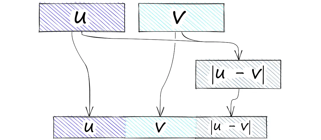 现在有两种句子嵌入。我们将嵌入式 A 称为 u,将嵌入式 B 称为 v。下一步是连接 u 和 v:
