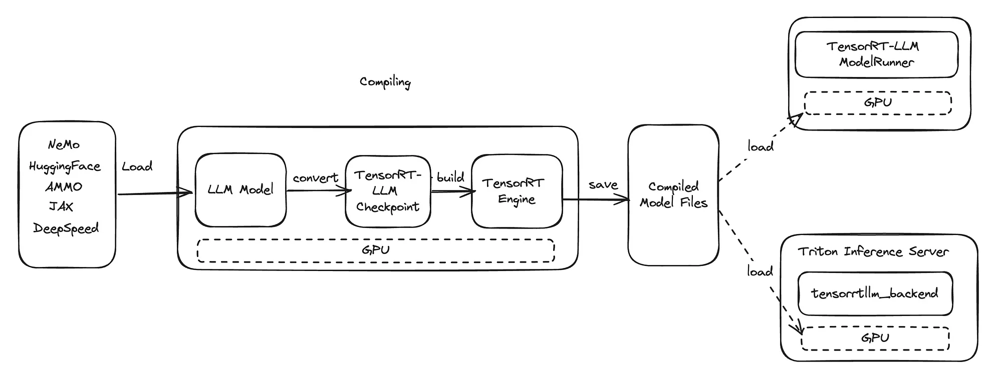 生成的 TensorRT 引擎文件将被存储并用于 Triton 推理服务器上的 TensorRT-LLM ModelRunner 或 tensorrtllm_backend 后端进行推理。