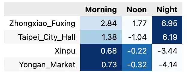 Z_df = Z_df.loc[['Zhongxiao_Fuxing', 'Taipei_City_Hall', 'Xinpu', 'Yongan_Market'], :]