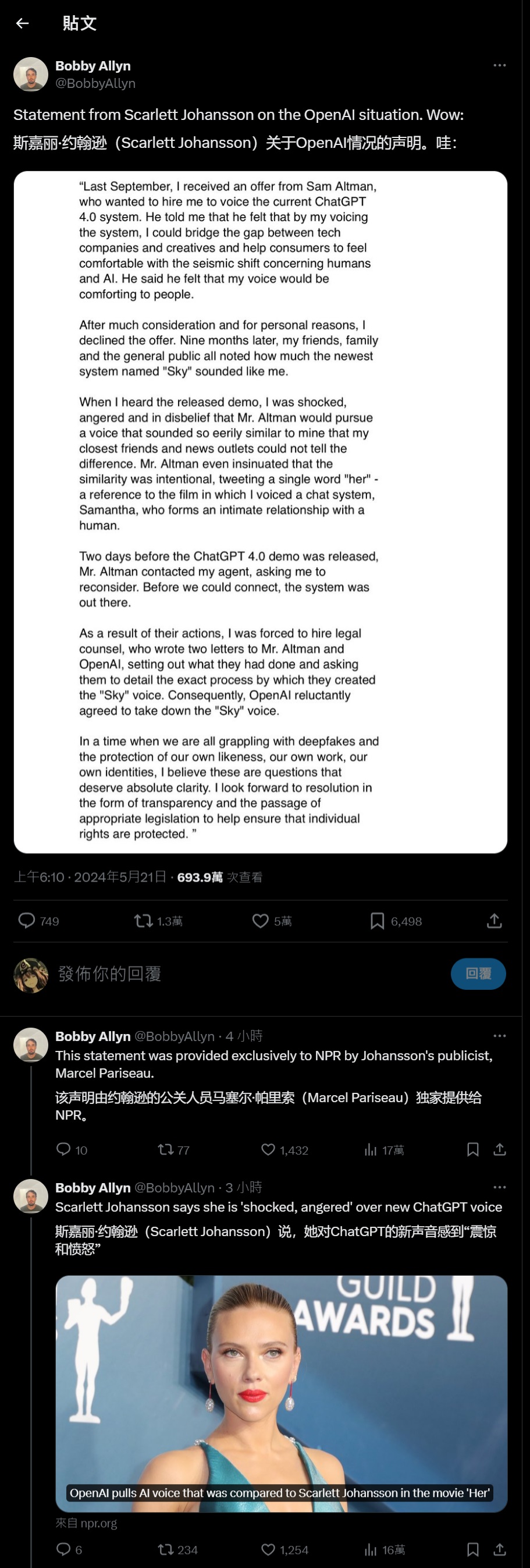 在舆论压力下,Altman发表声明,否认Sky的声音是模仿约翰逊的,并表示在选择配音演员前并未联系约翰逊。他强调,出于对约翰逊的尊重,OpenAI已暂停在产品中使用Sky的声音,并对未能与约翰逊进行充分沟通表示歉意。