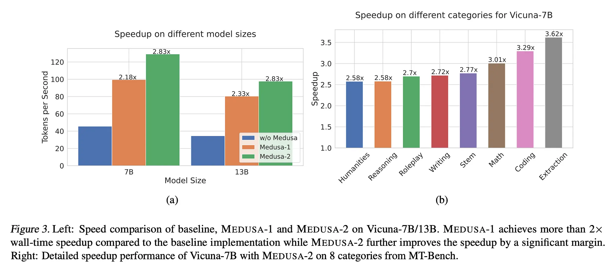 使用 Medusa 可以显著提高速度。从上图中我们可以看到,将 Vicuna(一种流行的开源 LLM)的速度提高了两到三倍。
