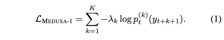 Medusa-1 包括冻结模型中除 Medusa 头以外的所有权重。通过只在 Medusa 头中运行梯度,我们不必担心降低原始模型的性能(性能保持不变),而且可以提高 Medusa 头的性能。下面的损失函数显示了它们如何将正确的地面实况标记与正确的Medusa头像相匹配。