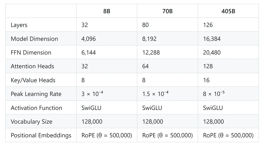 7 月 24 日,Meta 正式开源了 Llama 3.1,其中包括带有 8B、70B 和 405B 参数的版本。三种型号的具体信息详见下表。除了 BF16 精度外,405B 型号还有 FP8 量化版本。8B 版本开源了一个额外的内容安全分类调整模型 Llama-Guard-3-8B。这些模型支持 128k 上下文,精通八种语言,包括英语、德语和法语。Llama 3.1 的训练过程包括两个关键阶段:预训练和后训练。在预训练阶段,Llama 3.1 使用定制的 GPU 集群对超过 15 万亿个词块进行了训练。后训练阶段包括监督微调 (SFT)、拒绝采样和直接偏好优化 (DPO)。