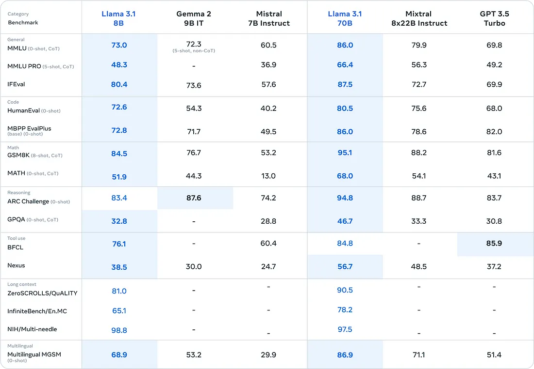 从有关 Llama 3.1 和 Llama 3 的论文中可以看出,Llama 3.1 有了显著的改进。3.1 8B 模型在数学和编码方面优于之前的 70B 模型。
