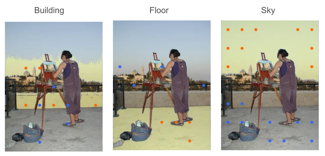 橙色的点代表与标签相关的点,蓝色的点代表标签的负点。正如你所看到的,它能以相当高的精度检测目标标签坐标。需要注意的是,该点的精度来自 CLIP 功能。因此,如果 CLIP 无法理解目标,就无法准确提供目标点。