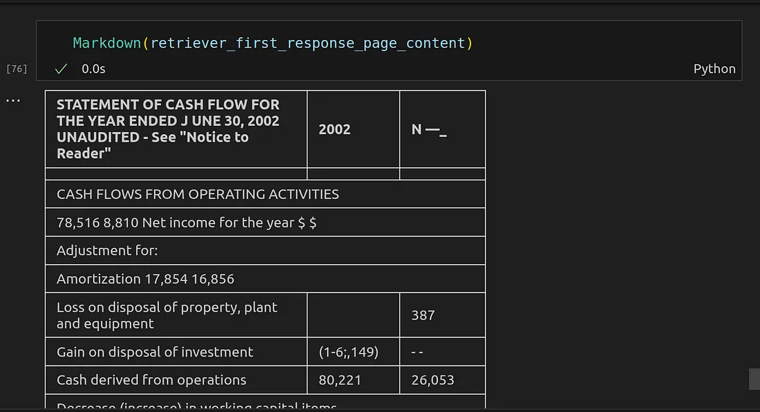 retriever_first_response = retriever.invoke("Give me a summary of the CASH FLOWS FROM OPERATING ACTIVITIES in a table format for the year 2001 and 2002")print(retriever_first_response)