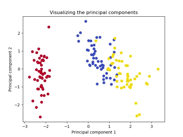 换句话说,第一个主成分维度贡献了73%的方差解释,第二个贡献了23%。因此,如果我们将维度降低到两个,我们就能保留大约73% + 23% = 96%的方差解释。