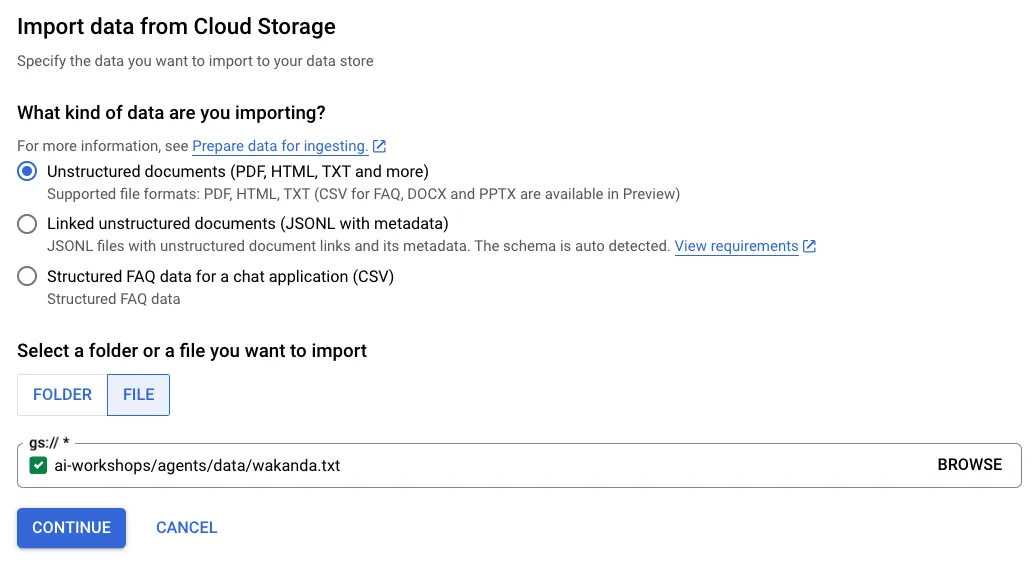 在本文的后续部分,你将探索如何为现有的代理创建并附加一个包含瓦坎达替代地点的数据存储。