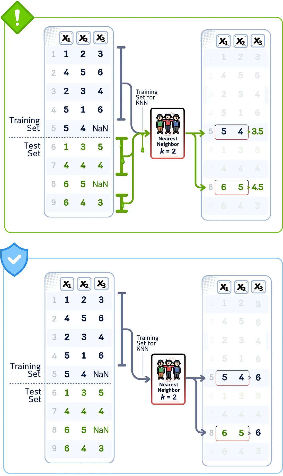当你对所有数据使用KNN(K-最近邻)算法来填充缺失值时,该算法会从训练集和测试集中找到相似的数据点。它创建的替代值是基于这些附近点的,这意味着测试集的值会直接影响你的训练数据中的内容。由于KNN查看的是实际的附近值,因此这种训练信息和测试信息的混合甚至比使用简单的平均值填充更加直接。总结来说: