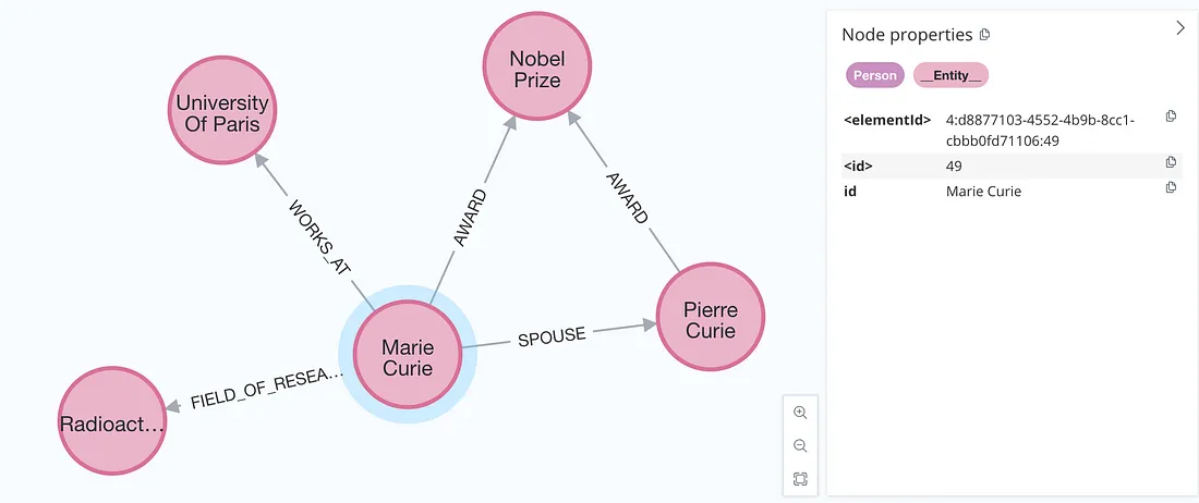 我们已经启用了LLM(大型语言模型)来添加它认为相关的任何节点或关系属性。例如,它选择包括玛丽·居里的出生和死亡日期、她在巴黎大学担任教授的角色,以及她两次获得诺贝尔奖的事实。这些额外的属性极大地丰富了提取的信息。