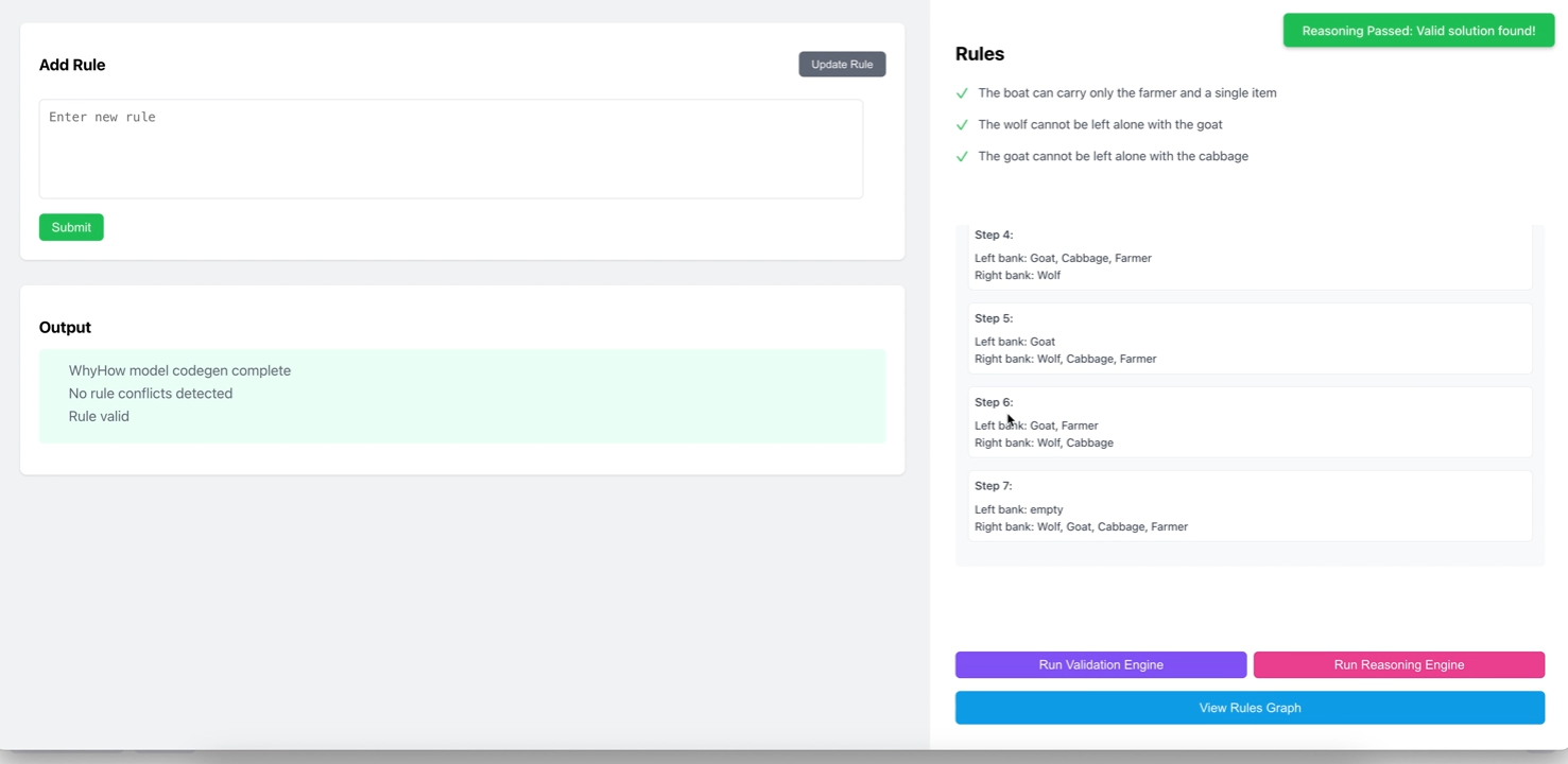 我们构建了一个基于Python的推理和验证框架,该框架受Pydantic启发,使开发人员和非技术领域的专家能够轻松构建复杂的规则引擎。这个过程对开发人员来说极易扩展,我们已经微调了一个模型,该模型有助于从自然语言指令中自动构建规则。虽然每种问题都需要一定程度的定制,但许多商业问题可以使用类似的框架(例如,物流->食品配送)。这个符号推理和验证框架在你想将标准操作程序(SOPs)和其他业务护栏转化为可执行的代码时非常有用。从后文的过河谜题中可以看出,它还可以用于构建问题解决的推理框架。