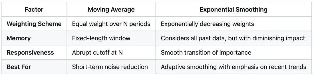 在时间序列预测中,平滑方法有助于过滤噪声并揭示潜在模式。两种最广泛使用的技术是移动平均和指数平滑。这两种方法都会为过去的观测值分配权重,但它们在处理近期数据与较旧数据的方式上存在根本差异。