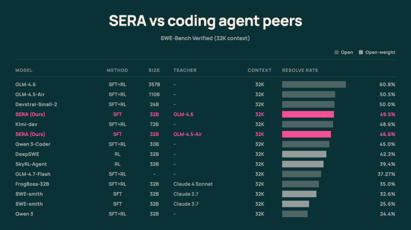 该系列的首次发布名为SERA,即软验证高效代码库代理,能够解决超过55%的SWE-Bench验证问题,这一基准超越了先前同等规模的开源模型。