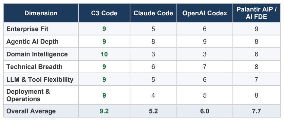 公司通过Anthropic PBC的Claude进行的独立评估结果支持其主张,该评估将C3 Code的应用程序生成能力与OpenAI Group PBC的Codex(6.0)和Palantir Systems Inc.的AIP(7.7)等模型进行了比较。C3 Code在“领域智能”方面表现尤为出色,得分为满分10分。