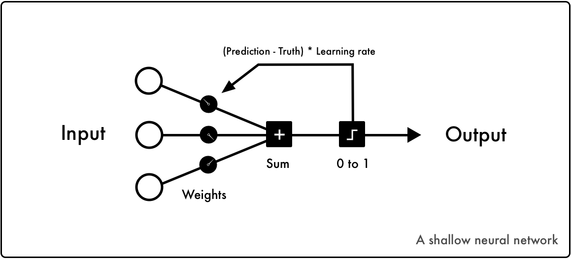 神经网络以同样的方式运作。它知道输入和输出并调整齿轮以找到两者之间的相关性。给定一个输入,它会调整齿轮来预测输出。然后,它将预测值与实际值进行比较。